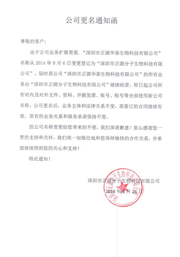 由于公司業(yè)務拓展需要,“深圳市正源華茶生物科技有限公司”名稱從2014年8月6日變更登記為“深圳市正源分子生物科技有限公司”。特此通知,詳情請瀏覽圖片內容。