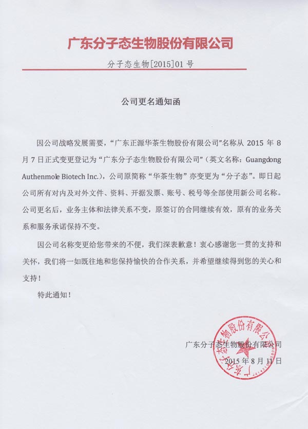 因公司戰(zhàn)略發(fā)展需要, “廣東正源華茶生物股份有限公司”名稱從2015年8月7日正式變更登記為“廣東分子態(tài)生物股份有限公司”。特此通知,詳情請(qǐng)瀏覽圖片內(nèi)容。