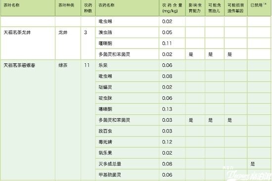 報(bào)告負(fù)責(zé)人王婧稱綠色和平的調(diào)查人員隨機(jī)購買了18種普通消費(fèi)者最經(jīng)常接觸的中檔茶葉、售價(jià)在60元至1000元一斤,品種涵蓋綠茶、烏龍茶和茉莉花茶等、檢測(cè)結(jié)果顯示,9個(gè)品牌的所有18個(gè)茶葉樣品全部含有至少三種農(nóng)藥殘留、12份茶葉樣本檢出滅多威、硫丹及氰戊菊酯等違禁農(nóng)藥殘留,14份含有多菌靈、苯菌靈等影響生育能力、胎兒發(fā)育或可能損害遺傳基因的農(nóng)藥殘留。